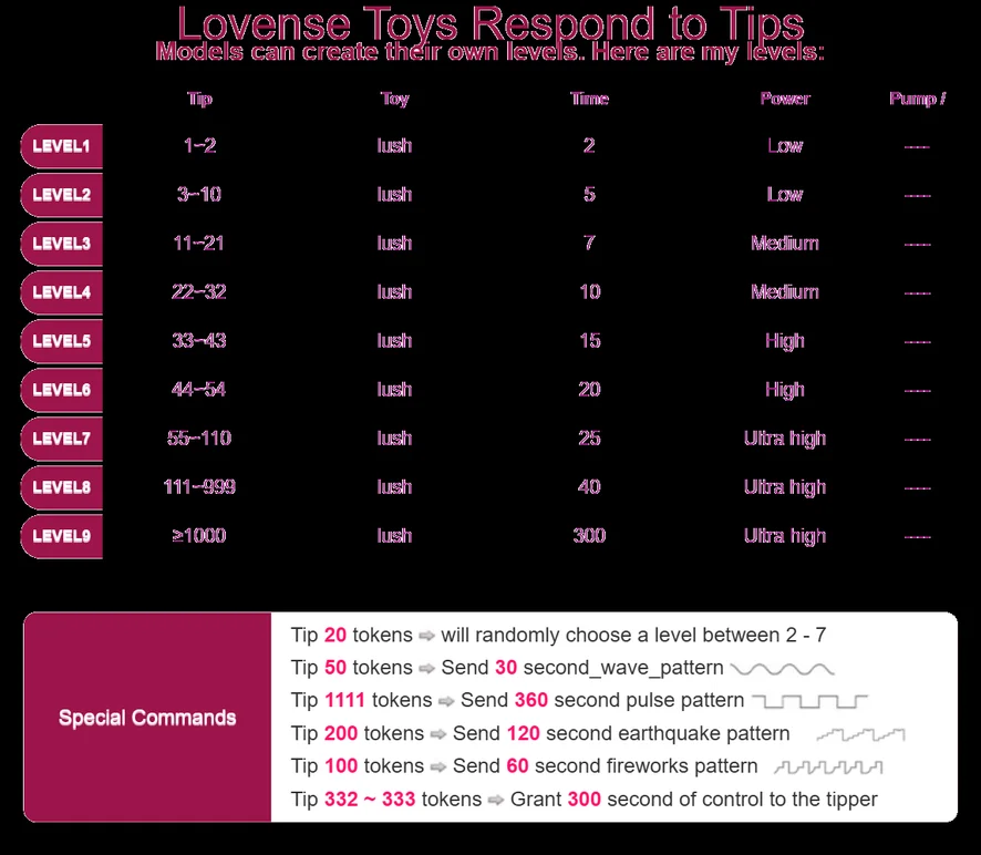 Ahegao, Masturbasi, Merokok, Rok atas, Cowgirl, Doggy Style, Striptis, Memukul, Pertunjukan Minyak, Tarian Erotis, Fetish Kaki, Dildo atau Vibrator, Handjob, Heels, Meraba, Blowjob, Mainan Seks